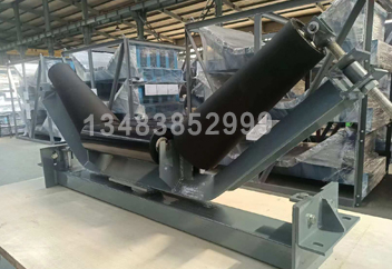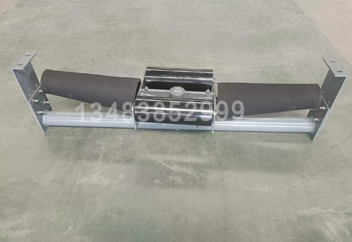雙中輥調(diào)偏托輥組回轉(zhuǎn)軸焊在下橫梁上,回轉(zhuǎn)總成包括組合軸承、回轉(zhuǎn)軸套)安裝在下橫梁上,回轉(zhuǎn)總成外圍設(shè)計(jì)了可擺動(dòng)的中托輥橫梁以回轉(zhuǎn)軸為中心,在運(yùn)行膠帶前、后中托輥橫梁各設(shè)置一個(gè)中托輥形成以回轉(zhuǎn)軸為中心的平衡支撐。側(cè)托輥采用加大軸承和軸徑設(shè)計(jì),用側(cè)托輥軸代替常規(guī)的側(cè)托輥橫梁功能。側(cè)托輥可拆卸的安裝在兩中輥中間。側(cè)托輥為錐形輥設(shè)計(jì),錐形輥采用鑄橡膠結(jié)構(gòu),其在膠帶跑偏時(shí)能產(chǎn)生較大的回向阻尼效果,從而使膠帶居中平穩(wěn)運(yùn)行。